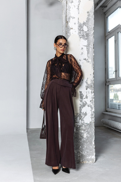 - Zjawiskowa, transparentna koszula o zmysłowym, koronkowym wykończeniu. Model z szerokimi rękawami wykończonymi efektowną falbaną nadaje lekkości całej stylizacji. Z przodu subtelna wiązana kokarda.
